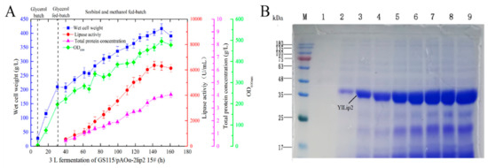 (A) Wet cell weight, lipase activity, total protein concentration, and optical density at 600 nm (OD600) during high-density fermentation of recombinant strain GS115/pAOα-2lip2 #15 in a 3 L fermenter. (B) SDS-PAGE analysis of GS115/pAOα-2lip2 #15 supernatants during high-cell-density fermentation in a 3 L fermenter. Lane M, molecular weight marker; lanes 1–9, culture supernatants of GS115/pAOα-2lip2 #15 at 8, 30, 50, 74, 90, 110, 125, 141, and 161 h. Data are the mean ± standard deviation of triplicate experiments.