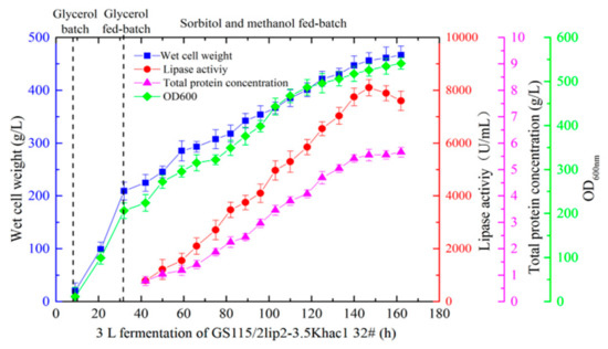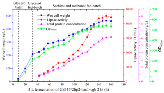 Wet cell weight, lipase activity, total protein concentration, and OD600 during high-density fermentation of recombinant strain GS115/2lip2-hac1-vgb #21 in a 3 L fermenter. Data are the mean ± standard deviation of triplicate experiments.