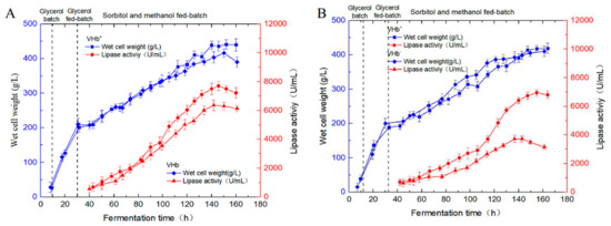 (A) Comparison of wet cell weight and lipase activity for GS115/pAOα-2lip2 #15 and GS115/2lip2-ZAvgb #13 in a 3 L fermenter under the higher dissolved oxygen (DO) concentration (about 50%). (B) Comparison of wet cell weight and lipase activity for GS115/pAOα-2lip2 #15 and GS115/2lip2-ZAvgb #13 in a 3 L fermenter under the lower DO concentration (about 10%). Data are the mean ± standard deviation of triplicate experiments.