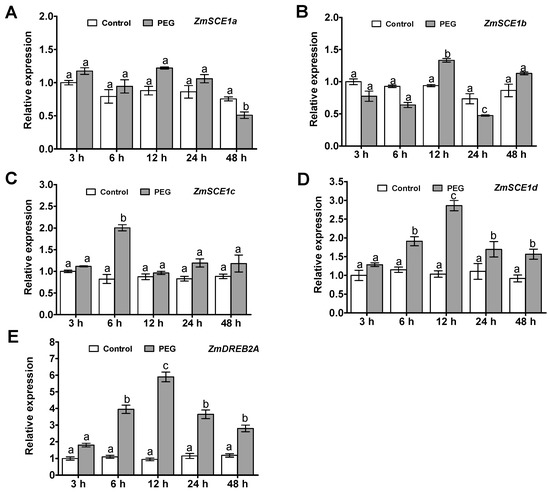 Meanwhile, to show the effectiveness of the treatment, we examined the expression of the drought- or osmotic-responsive gene ZmDREB2A [40] in maize seedlings under PEG6000 treatment by qPCR. As expected, compared to their corresponding controls, significantly increased expression of the stress-inducible marker gene ZmDREB2A was observed under PEG-induced osmotic stress (Figure 2E). These data suggest that the class-I ZmSCE1 genes showed differential response patterns under drought stress. In particular, expression of the ZmSCE1d was upregulated upon osmotic stress.