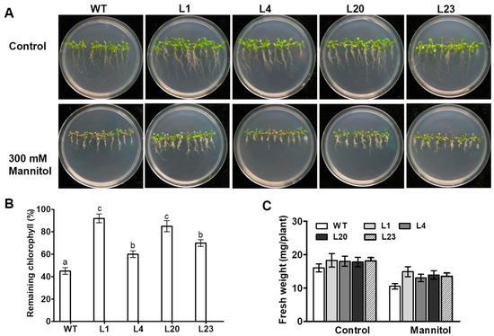 For osmotic stress tolerance analysis, surface-sterilized seeds of four transgenic Arabidopsis lines (L1, L4, L20, and L23) or wild type (WT) were germinated and cultured on 1/2 MS medium for 10 days, and then the seedlings were transferred to vertically grow on 1/2 MS medium supplemented with 0 or 300 mM mannitol in the growth chamber. The phenotypes of seedlings were recorded after 10 days.
