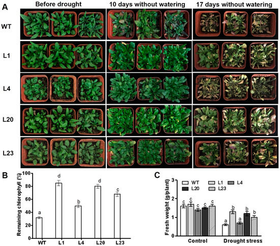 For drought tolerance analysis, three-week-old WT and four transgenic Arabidopsis lines in soil were exposed to progressive drought by withholding water for 17 days. After that, fresh weight and remaining chlorophyll content in stressed WT and transgenic plants were determined as described previously [56]. These experiments were conducted in three biological replicates.