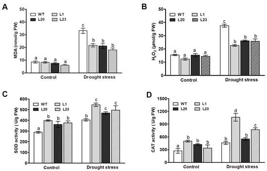 H2O2 levels were then measured in both WT and the three transgenic lines upon drought stress. As shown in Figure 5B, after 12 h of 20% PEG treatment, the H2O2 levels in both transgenic lines and WT plants markedly increased compared to their corresponding controls (Figure 5B). However, there were differential magnitudes of increases in these types of plants. For example, H2O2 levels in these three transgenic lines (~75% increase on average) were significantly lower than the WT (~150% increase), showing that WT plants accumulated higher levels of H2O2 relative to these transgenic lines upon drought stress (Figure 5B). These physiological indices implied that the different levels of lipid peroxidation and ROS accumulation in both WT and transgenic lines could be in correlation with their differential tolerance to drought stress.