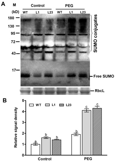 To study effect of ZmSCE1d overexpression on sumolylation under control and drought conditions, SUMO conjugates in both WT and ZmSCE1d-transgenic lines were detected by Western blotting using the anti-AtSUMO1 antibody. As shown in Figure 6, under control conditions, SUMO conjugates in both transgenic lines obviously increased (~50% increase averagely, relative to the WT) (Figure 6A,B). After 6 h-PEG treatment, accumulation of the SUMO conjugates in either WT or transgenic lines was significantly elevated (~180% increase for the transgenic lines averagely and ~90% increase for the WT) compared with their corresponding controls (Figure 6A,B). This suggested that ZmSCE1d overexpression facilitated sumoylation in transgenic Arabidopsis plants under drought stress.