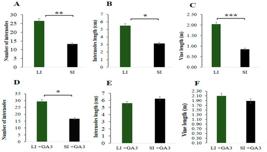 Agronomic traits of long and short internode plants. (A) Number of internodes, (B) Internodes length (cm), and (C) Vine length (m) before GA3 application. (D) Number of internodes, (E) Internodes length (cm) and (F) Vine length (m) after GA3 application. Data were averages of three biological replications taken from three plants. LI = Long internodes, and SI= Short internodes before GA3 application. LI + GA3 = Long internodes, and SI + GA3 = Short internodes after GA3 application. Error bars indicates standard deviations from three repeats (n = 3). Values are means + SD (n = 3). * significant at p < 0.05; ** significant at p < 0.01 and *** significant at p < 0.001 probability levels.