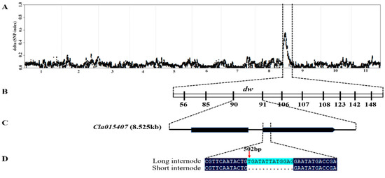 The whole genome resequencing (WGR) through BSA-seq approach was used for identifying the genomic region contributing to the short internode phenotype. A total of 30.1 Gb raw data having approximately 30 × depth and more than 99% coverage for each pool were generated. After filtering out adaptor and low quality reads, the clean reads were aligned to ‘97103′ watermelon reference genome (http://cucurbitgenomics.org/organism/v1, accessed on 5 June 2019), to identify high quality SNPs between the long internode and short internode pools. From the L-pool and S-pool, 102,832,531 and 108,242,182 short reads were generated through the high-throughput sequencing, respectively. Furthermore, after clean reads were aligned to watermelon reference genome, 304,565 SNPs were obtained between the two mixed pools. Finally, using the ΔSNP index strategy, we identified a candidate region on chromosome 9 (Figure 3A). Therefore, these results indicated that there was a locus, designated dw, responsible for the short internode trait located between 9.433 kb to 34.42 Mb on chromosome 9.