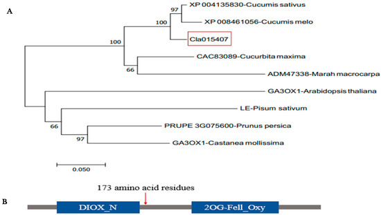 The BLAST result in TAIR (https://www.arabidopsis.org, accessed on 23 May 2019) indicated that Cla015407 was highly homologous to AT1G15550 in Arabidopsis thaliana, which encodes GA 3β-hydroxylase enzyme. This enzyme is involved in the later steps of the gibberellic acid biosynthetic pathway activated by AGAMOUS in a cal-1 and ap1-1 background [53,54]. To understand the relationship between Cla015407 protein sequences and other homologous, we BLAST the protein sequence of Cla015407 in both NCBI (http://www.ncbi.nlm.nih.gov/, accessed on 24 May 2019) and Uniprot database (https://www.uniprot.org/, accessed on 23 May 2019). The phylogenetic tree was generated using the neighbor-joining method as implemented in MEGA7 software through bootstrap method with 1000 replications [55]. The result indicated that Cla015407 gene has a close relationship and shares a common ancestor with XP004135830 from Cucumis sativus and XP008461056 from Cucumis melo (Figure 4A). This indicated that the Cla015407 was evolutionarily conserved within the Cucurbitaceae family. Furthermore, we generate the protein domain structure for Cla015407 using the online Pfam database (http://pfam.xfam.org/, accessed on 23 December 2019). The sequence alignment using UniProt and SMART indicated that Cla015407 was shared 57.10% sequence identity with AT1G15550 in Arabidopsis thaliana, which containing two domains: DIOX_N and 2OG-Fell_Oxy [44]. The deletion in the CDS region of short internode watermelon caused a premature stop codon, producing a truncated protein with only 173 amino acid residues, losing the 2OG-Fell_Oxy domain (Figure 4B).