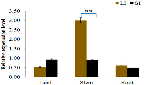 Relative expression level of Cla015407 in different tissues of both long and short internode parents, Error bars indicates standard deviations from three repeats (n = 3). Values are means + SD (n = 3). LI = Long internodes, SI = Short internodes. ** Significant at p < 0.05 probability level.
