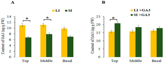 GA3 content in top, middle and basal internodes of long and short internode plants. (A) GA3 content before GA3 application, (B) GA3 content after GA3 application. LI = Long internode, and SI = Short internode before GA3 application; LI + GA3 = Long internode, and SI + GA3 = Short internode after GA3 application. Error bars indicates standard deviations from three repeats (n = 3). Values are means + SD (n = 3). * significant at p < 0.05 probability level.