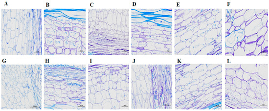 To observe the difference in length and size of cells between short and long internode plants, samples were collected from three different internode positions (top, middle and basal). Before GA3 application, the length and thickness of cells in the short internode plants were significantly reduced (Figure 7G–I) compared with long internode plants (Figure 7A–C) in all internode positions. In the short internode plants, the cell length in the basal internode position was reduced; whereas, the cell size was increased (Figure 7I) compared with long internode plants (Figure 7C). After GA3 application, the length and size of cells in the short internode plants were increased (Figure 7J,K), and had no significant difference with long internode plants in all internode positions (Figure 7D,E) except in the basal internodes (Figure 7F,L). Therefore, these results further suggested that loss of function of Cla015407 led to shorter cells and internode length in watermelon.