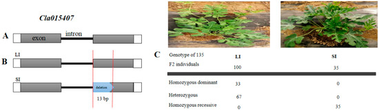 The protein sequence alignment was performed using Uniprot (https://www.uniprot.org/, accessed on 27 May 2019) and SMART (https://blast.ncbi.nlm.nih.gov/smartblast/, accessed on 27 May 2019, databases to illustrate the domain structure. Phylogenetic analysis was performed using MEGA 7 software (The Pennsylvania State University, University Park, PA, USA) with a bootstrap method and 1000 replications [93]. Moreover, to validate the causal mutation, an InDel marker was developed conferring to the 13 bp sequence of Cla015407 and 135F2 progenies including the recombinant individuals were selected to check the polymorphism of the marker.