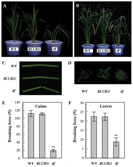 The phenotypes of df plants. (A) Tillering stage plants. (B) Filling stage plants. Brittleness of culms (C) and leaves (D). Breaking force for culms (E) and leaves (F). The second internode and flag leaves of filling stage plants were used for the test. When testing the culm, the leaf sheath was included. Error bar indicates ± SD from at least four biological repeats. ** Indicates significant difference (p < 0.01) between the df (drooping and fragile) mutant and RCCR1i plants.