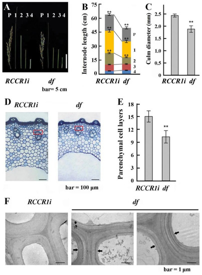 Differences in height and anatomical structures of internodes in RCCRi and df plants. (A) Morphology of the internodes. Each internodes are numbered below the panicle (P) to the base. (B) Statistical analysis of length changes among different internodes between RCCRi and df culms. (C) Statistical analysis of culm diameter changes of the second internodes between RCCRi and df plants. Error bar in (B) and (C) indicates ± SD from 15 plants. (D) Cellular analysis of RCCRi and df culms. Transverse sections of culms in the second internodes showing the reduced cell layers in df culms. (E) Statistical analysis of numbers of parenchyma cell layers in the second internodes of RCCRi and df culms. Error bar indicates ± SD from six measurements. ** Significant difference (p < 0.01). (F) Ultrastructure of cell walls in vascular bundle sheath cells of the region indicated by the rectangles in (D). Arrows indicate regions contain layers of different electron-dense materials in df culms.