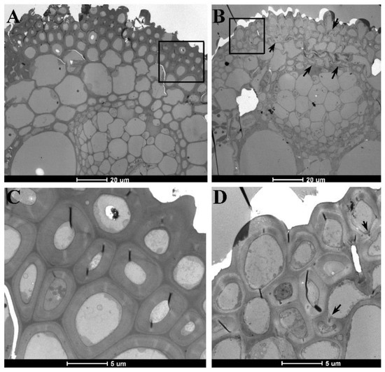 Electron microscopic observation of the sclerenchyma in the main leaf vein. Top of the main vein in leaves of RCCR1i (A) and df (B) plants. (C,D) Magnified sections of (A,B) showing the irregular shape and thin walls of sclerenchyma cells in the main leaf vein of df leaves. Arrows indicate the irregular shape cells.