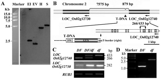 Southern blot analysis using a hygromycin phosphotransferase gene fragment as a probe revealed that the df mutant contained only one copy of the T-DNA insertion (Figure 4A). The flanking sequences bordering the T-DNA tag were obtained using the thermal asymmetric interlaced (TAIL)-PCR method [29]. The insertion site was identified as being 879 bp downstream of the stop codon of the LOC_Os02g12740 (Os02g0219400) gene, and 7575 bp before the start codon of the LOC_Os02g12730 (Os02g0219200) gene (Figure 4B). The LOC_Os02g12730 gene encodes a β-galactosidase family protein (OsBGAL1), which is homologous to Arabidopsis BGAL1 (At3g13750). The LOC_Os02g12740 gene (OsGPI8) encodes a putative catalytic subunit of GPI-T, which is the homolog of Arabidopsis GPI8 (At1g08750).