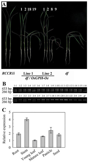 To confirm whether the OsGPI8 gene was responsible for the df mutant phenotype, the cDNA containing the complete coding sequence of the wild-type OsGPI8 gene was cloned into the binary vector pCAMBIA2301. OsGPI8 driven by the cauliflower mosaic virus 35S promoter (OsGPI8-Oe) was then introduced into df mutant plants via Agrobacterium tumefaciens-mediated transformation. A total of 11 transgenic lines (df GPI8-Oe) were obtained. Of these, two independent T2 lines that displayed a ca. 3:1 segregation ratio (17:5 and 7:2) of normal to df mutant plants were studied in detail (Figure 5A). The presence of the artificial OsGPI8 in genomes of transgenic plants was determined by PCR analysis. An introduced cDNA fragment of the expected length (266 bp) was found in all morphologically normal plants, but it was absent from plants with the mutant phenotype in both of the two independent T2 lines (Figure 5B). In addition, complemented plants (df GPI8-Oe) showed similar cellulose content (292.5 ± 1.61 to 300.7 ± 1.12 mg per gram of alcohol-insoluble residues) in leaves with RCCR1i plants. These results confirmed that overexpression of the wild-type OsGPI8 cDNA complemented the mutant phenotype. The OsGPI8 gene was expressed in all tissues tested by real-time quantitative PCR (qRT-PCR), including roots, stems, leaves, panicles, and seeds (Figure 5C), suggesting that it plays roles in most tissues of rice plants.