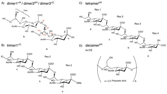 - Yongye, A.B.; Gonzalez-Outeiriño, J.; Glushka, J.; Schultheis, V.; Woods, R.J. The conformational properties of methyl alpha-(2,8)-di/trisialosides and their N-acyl analogues: Implications for anti-Neisseria meningitidis B vaccine design. Biochemistry 2008, 47, 12493–12514. [Google Scholar] [CrossRef]
