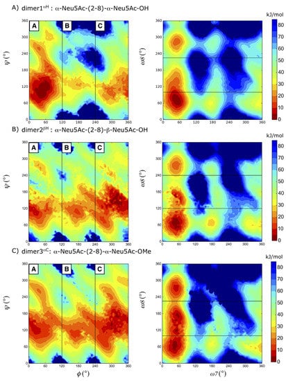 - Spiwok, V.; Tvaroska, I. Conformational Free Energy Surface of α-N-Acetylneuraminic Acid: An Interplay Between Hydrogen Bonding and Solvation. J. Phys. Chem. B 2009, 113, 9589–9594. [Google Scholar] [CrossRef] [PubMed]