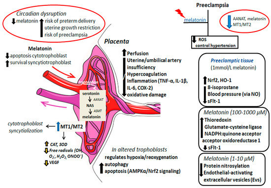 - Zhao, M.; Li, Y.; Xu, L.; Hickey, A.; Groom, K.; Stone, P.R.; Chamley, L.W.; Chen, Q. Melatonin prevents preeclamptic sera and antiphospholipid antibodies inducing the production of reactive nitrogen species and extrusion of toxic trophoblastic debris from first trimester placentae. Placenta 2017, 58, 17–24. [Google Scholar] [CrossRef]