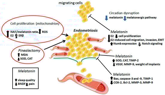 - Yilmaz, B.; Kilic, S.; Aksakal, O.; Ertas, I.E.; Tanrisever, G.G.; Aksoy, Y.; Lortlar, N.; Kelekci, S.; Gungor, T. Melatonin causes regression of endometriotic implants in rats by modulating angiogenesis, tissue levels of antioxidants and matrix metalloproteinases. Arch. Gynecol. Obstet. 2015, 292, 209–216. [Google Scholar] [CrossRef]