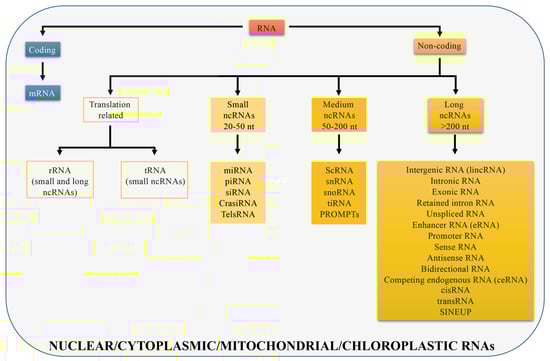 Different RNA types in cells. RNAs are divided in coding (if they are translated; blue) and non-coding (if they are not translated; yellow). Non-coding RNAs can be distinguished in different RNA types depending on their size or function. Long non-coding RNAs are longer than 200 nt and all displayed categories are discussed in the manuscript. Transcripts presented can be localized in the cell nucleus, cytoplasm, or in both compartments, in mitochondria or chloroplasts.