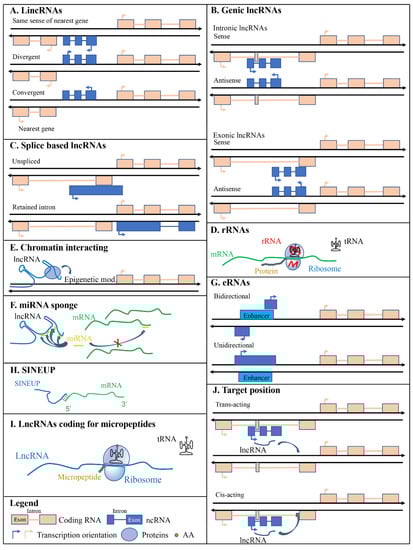 Scheme of different types of long non-coding RNAs (lncRNAs). (A) licRNAs are localized between coding genes and do not overlap any of them. (B) Genic lncRNAs are overlapped to coding sequences. (C) Splice variants. (D) Ribosomal RNAs are components of ribosomes. (E) Chromatin interacting lncRNAs allow chromatin modifications permitting the correct localization of modifying enzymes. (F) miRNA sponging lncRNAs reduce the availability of miRNAs to modulate the expression of their mRNA target. (G) Enhancer lncRNAs are transcribed from DNA regions with enhancing functions. (H) SINEUPs are lncRNAs that associating to mRNAs are able to enhance their translation. (I) lncRNAs can also code for micropeptides. (J) lncRNAs are distinguished according to the position of their targets. Green arrows indicate protein (E), miRNA (F), or lncRNA (J) targets. AA is for amino acids.