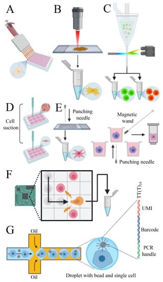 Methods to isolate single cells. (A) Micropipette isolation method consists of diluting the sample until obtaining a single cell on each well. (B) Laser capture microdissection utilizes a laser linked to a microscope to collect single cells from solid tissues. (C) Fluorescent activated cell sorting can sort cells tagged with fluorescent markers. (D) Capillary-based technology employs mechanical suction to isolate the cells. (E) Punching technologies are based on the principle of capturing cells on microwells and “punch” them on collection vials. (F) The dielectrophoresis system uses the electrokinetic properties of cells to move them on a chip. (G) Microfluidic platforms can capture single cells and barcoded beads into droplets of water in an oil phase. Each bead contains several primers composed by PCR handles, cell barcodes, and unique molecular identifiers (UMIs) sequences. PCR handles are common in all beads and allows PCR amplification after cDNA synthesis. Cell barcode sequences, identical across all the primers of the same microparticle but different from those on different beads, allow recovery of the cells’ origin. UMIs, different on each primer, allow mRNA transcripts to be digitally counted and to identify PCR duplicates. An oligod(T) sequence is present at the end of all primers for capturing polyadenylated RNAs and priming reverse transcription.