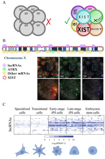 (A) Single-cell RNA sequencing of 8-cell embryos revealed that, contrary to what was previously believed, each cell has a different set of expressed genes and that the expression of XIST is not equal in the eight cells. (B) A scheme of an inactivated X chromosome with lncRNA XIST represented by red rectangles. Some genes are transcribed from this chromosome even if it is considered inactivated. Expressed lncRNAs are represented by purple semicircles while mRNAs are shown in yellow semicircles. In green, it is marked the position of ATRX, one of the mRNAs that escape the inactivation of the X chromosome. Microscope images show the expression of XIST (red), ATRX (green) and the position of the two X chromosomes (blue). Moreover, it is represented an enlargement of a single nucleus (white rectangle) for each staining. FISH images are modified from [155]. (C) Differences in lncRNA expression between cells at different stages of reprogramming. Some lncRNAs seem to be specifically expressed in the less specialized cells, suggesting that they might be involved with the maintenance of the pluripotency of stem cells and that might be used as tools to induce specialized cells to transition into less specialized cells (like iPSCs). Heat map is modified from [156].