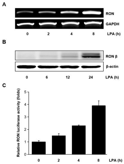 Human bladder cancer T24 cells were treated with LPA for different periods, and the mRNA level of RON was measured. As shown in Figure 2A,B LPA upregulated the expression of RON mRNA and protein in a time dependent manner. The effect of LPA on the RON transcription was also examined. With the LPA treatment, pGL3-RON transfected T24 cells showed a time dependent increase in luciferase activity (Figure 2C). As shown in Supplementary Figure S1, LPA induced RON expression in a dose dependent manner revealed by Western blot analyses. Supplementary Figure S2 shows that the LPA concentration in the present experiment did not affect T24 cells’ viability.