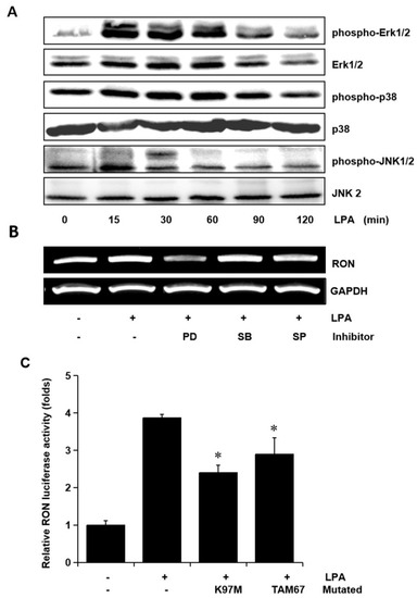 To examine whether the MAPK signaling pathways were involved in LPA mediated RON induction, the levels of phosphorylated Erk-1/2, JNK, and P38 MAPK in the T24 cells exposed to LPA for different periods were assessed. The LPA treatment induced an increase in Erk-1/2, JNK, and p38 MAPK phosphorylation, but did not affect their protein levels (Figure 4A). In order to examine the specific signals of MAPKs in RON induction by LPA, T24 cells were pretreated with PD98059 (PD, a MEK inhibitor), SB203580 (SB, a P38 MAPK inhibitor), and SP600125 (SP, a JNK inhibitor) prior to LPA exposure. Figure 4B shows that both the Erk-1/2 inhibitor (PD) and JNK inhibitor (SP) partially blocked RON induction by LPA, whereas the p38 MAPK inhibitor (SB) had no effect. In addition, LPA induced RON promoter activity was also partially inhibited when the expression vector of dominant negative mutants of Erk-1/2 (K97M) or JNK (TAM67) were co-transfected with pGL3-RON into the T24 cells (Figure 4C).