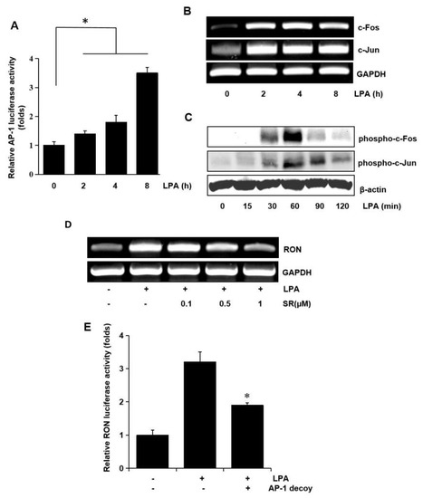 Involvement of the AP-1 transcription factors in LPA induced RON expression. (A) Cells were transiently transfected with the pAP-1 luciferase reporter construct and then incubated with 5 μM LPA for 0–8 h. After incubation, the cells were lysed, and luciferase activity was measured. Bars show the mean standard deviation from three measurements. (B) T24 cells were incubated with 5 μM LPA for 0–8 h, and the mRNA levels of c-fos and c-jun were determined by RT-PCR. (C) T24 cells were incubated with 5 μM LPA for 0–120 min, and the levels of c-fos and c-jun phosphorylation were determined by Western blot analysis. (D) T24 cells pretreated with SR11032 (SR, AP-1 inhibitor, 0–1 μM) were incubated with 5 μM LPA for 8 h, and RON mRNA levels were determined by RT-PCR. (E) T24 cells were transfected with an AP-1 decoy for 48 h and co-transfected with a RON promoter reporter overnight. After incubation with 5 μM LPA for 8 h, luciferase activity was measured with a luminometer. Bars show the mean standard deviation from three measurements. * p < 0.05 vs. LPA only.
