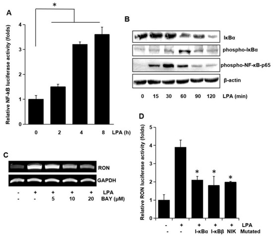 Involvement of the NF-κB transcription factor in LPA induced RON expression. (A) Cells were transiently transfected with the pNF-κB luciferase reporter construct and then incubated with 5 μM LPA for 0–8 h. After incubation, the cells were lysed, and luciferase activity was measured. Bars show the mean standard deviation from three measurements. (B) T24 cells were incubated with 5 μM LPA for 0–120 min, and the protein level of IκBa and level of IκBa and NF-κB-p65 phosphorylation were determined by Western blot analysis. (C) T24 cells were pretreated with BAY11-7082 (BAY, an NF-κB inhibitor, 0–20 μM) were incubated with 5 μM LPA for 8 h, and RON mRNA levels were determined by RT-PCR. (D) T24 cells transfected with I-κBα, I-κBβ, and NIK dominant negative mutants were co-transfected with a RON promoter reporter overnight. After incubation with 5 μM LPA for 8 h, luciferase activity was measured with a luminometer. Bars show the mean standard deviation from three measurements. * p < 0.05 vs. LPA only.