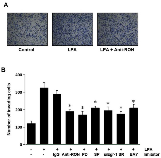 Expression of RON has been suggested to be essential for the invasive phenotype of cancer cells. The role of RON induced by LPA in T24 cells’ invasion was assessed by culturing the cells with an antibody specific for RON in a modified Boyden invasion chamber. Figure 8A shows that LPA could increase the cell invasiveness; however, the RON antibody can weaken the LPA induced cell invasion. These results indicate that induction of RON by LPA plays an important role in the invasiveness of bladder cancer cells. To confirm that MAPK (Erk-1/2 and JNK), Egr-1, AP-1, and NF-kB are involved in LPA induced T24 cell invasiveness, cells were pretreated with various signaling inhibitors PD98059 (PD), SP600125 (SP) siEgr-1, SR11302 (SR), and BAY11-7082 (BAY) prior to LPA treatment. Figure 8B shows that all the inhibitors used blocked LPA induced matrigel invasiveness. These results suggest that MAPK (Erk-1/2 and JNK) and transcription factors (Egr-1, AP-1, and NF-κB) activated by LPA upregulated RON, in turn leading to an increase in bladder cancer cell invasiveness.