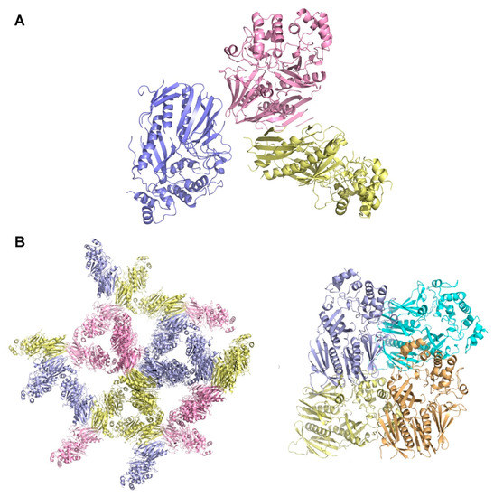 As shown by our previously reported results [43], the long rod-like crystals were obtained via high-concentration CT digestion. The crystals belonged to a P212121 orthorhombic lattice, with cell dimensions of a = 61.54, b = 76.76, and c = 102.86 Å (Figure 3B, right panel). One ASU contained one XcpVWX complex molecule, with a solvent content of only 34.0%, which is substantially lower than the 48.3% of the hexagonal space group. Unlike the molecular packing in the hexagonal lattice of the chunk-like crystals, in the orthorhombic lattice, molecules were packed into a tighter lattice with symmetry molecules. As a result, limited space was available for the solvent.