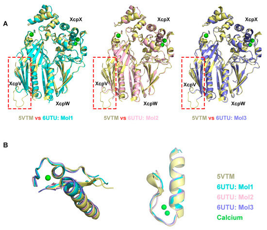 To better demonstrate the precise differences between the crystal structures in the two lattices, the complex structure of the orthorhombic lattice was superimposed pairwise with the three individual complex structures in the hexagonal lattice (Figure 4, Figure S2, and Table 2). The overall structures aligned well. The major missing residues in all three structures of the P3 hexagonal lattice were found in the XcpV molecules (Figure 4A, Figure S2a, and Table 2). They mainly lacked two connecting loops, namely: (1) 59–66, between the N-terminal α-helix and the β-sheet, and (2) 103–113, between the two β-strands. The β-sheet domains were not well established because of residue missing, especially in XcpV of Mol2. The XcpW structures were all intact in the four structures (Figure S2b and Table 2). Some loop regions in XcpX were also missing in the structures of 6UTU (Figure S2c and Table 2). However, the loop regions that formed the calcium binding sites in XcpX were well maintained (Figure 4B).