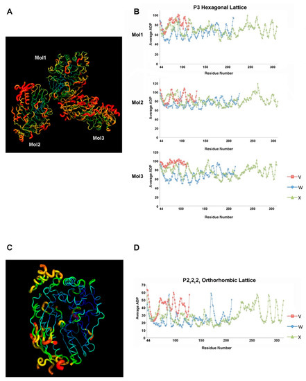 The atom displacement parameter (ADP; also called the temperature factor or B-factor) usually reflects the flexibility of the protein structure [44], which is related to the atomic thermal Debye–Waller factor in the lattice dynamics theory [45]. This critical crystallographic parameter is deemed to represent the atomic motion and static displacive disorder in protein structures [44,46].