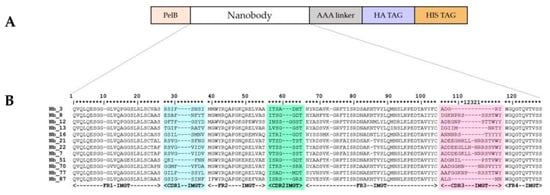 (A) Schematic representation of an Nb in the phagemid vector pMECS. Downstream of the PelB secretion sequence, the Nb-sequence is followed by a triple alanine linker, a hemagglutinin (HA), and hexa-histidine (His) tags. (B) Amino acid sequences of the anti-CD33 Nbs (numbering according to IMGT) [25]. The CDR1, CDR2, and CDR3 regions are highlighted in cyan, green, and pink, respectively. The amino acid sequence of the CDR3 region is displayed in alphabetical order. Position 10 in the framework region-1 (FR1-IMGT) and position 73 in the FR3-IMGT are gaps introduced to align to other V-GENE groups or subgroups. For Nb_7, Nb_21, and Nb_22, an amino acid deletion relative to other sequences occurred at position 85 (represented by a dash).