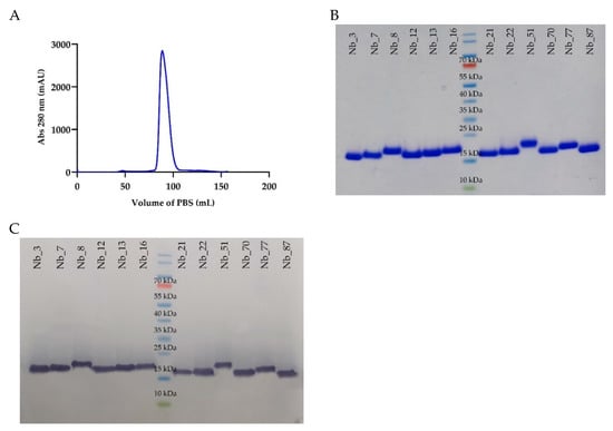 All twelve Nbs were expressed, extracted from the periplasm, and purified by immobilized metal affinity chromatography (IMAC) and size exclusion chromatography (SEC). The SEC profile gave one single symmetrical peak (Figure 2A), reflecting the good solubility and homogeneity of the Nb. The separation of the proteins on sodium dodecyl sulphate polyacrylamide gel electrophoresis (SDS-PAGE) of each sample revealed one single band with a molecular weight around 15,000, as expected for the size of an Nb, after Coomassie staining and western blot (Figure 2B,C).
