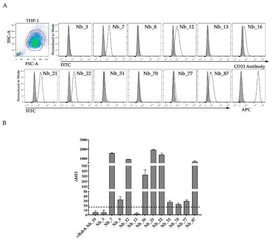 The ability of the generated anti-CD33 Nbs to recognize native human CD33 when expressed on the cell membrane was evaluated by flow cytometry, using THP-1 cells. Anti-CD33 Nbs were only considered as binders if the difference in mean fluorescence intensity (ΔMFI) signal was at least three times higher than the signal obtained with a non-targeting Nb. The ΔMFI obtained with anti-CD33 Nbs are shown in Figure 3A,B. From all generated anti-CD33 Nbs, six Nbs (Nb_7, Nb_12, Nb_16, Nb_21, Nb_22, and Nb_87) were shown to bind CD33 protein expressed on THP-1 cells.