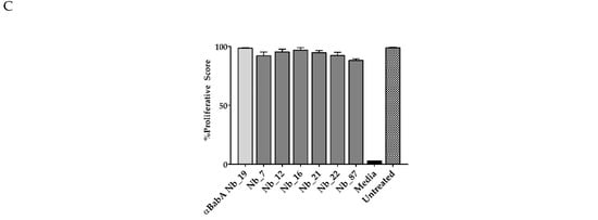 The impact of the six Nbs recognizing CD33 on the proliferation of THP-1 cells was evaluated via the alamarBlue assay (Figure 3C). The alamarBlue signal correlates with the number of viable cells. The proliferative signal obtained after four hours of incubation of THP-1 cells, with 5 µg of each anti-CD33 Nb, was the same as the signal obtained from the non-targeting Nb, indicating that the proliferative capacity of THP-1 cells was not affected by the presence of anti-CD33 Nbs, under our experimental conditions.