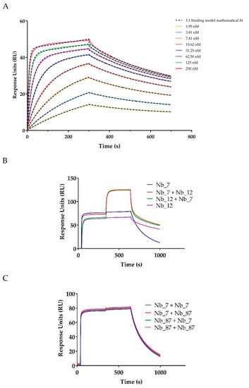 SPR sensorgram of Nb_12 on the CD33 ectodomain and epitope binning by SPR: (A) sensorgram of different concentrations (as indicated in the graph) of anti-CD33 Nb_12 binding to biotinylated recombinant human CD33 ectodomain. Kinetics were measured with a two-fold dilution series of Nbs (250–1.95 nM). The fitting of the binding curves using the 1:1 binding mathematical model calculated a KD of 3.9 nM. (B,C) Examples of a noncompetitive (independent) and a competitive (overlapping) epitope binding of two Nbs for the same antigen, respectively.