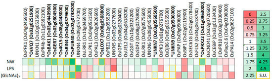 Relative expression levels of the 36 candidate genes in rice plants upon a four-hour treatment with NemaWater (NW; 133 nematode-equivalents/mL), lipopolysaccharides (LPS; 50 µg/mL) and N-acetylglucosamine heptamers (GlcNAc)7; 2.5 µg/mL). Each cell color-codes the expression of one of the 36 genes (columns) upon treatment with one of three pathogen-associated molecular patterns (PAMPs; rows). The legend for this color-coding stands right. Yellow-boxed cells indicate significant upregulations (S.U.). Expression levels were determined by RT-qPCR and are expressed relative to mock treated plants. RT-qPCRs were performed with two technical replicates on three biologically independent replicates. Genes in bold and with an asterisk were selected for further analysis.