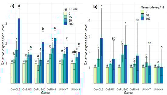 Relative expression levels of the final screening gene set in rice cell suspension cultures (RCSCs) upon a four-hour incubation with (a) 25, 50, and 200 µg LPS per mL cells and (b) 40 and 107 nematode-equivalents per mL cells. Expression levels were determined by RT-qPCR and are expressed relative to mock treated cells. RT-qPCRs were performed with three technical replicates on two biologically independent replicates. Error bars indicate the 95% confidence interval as calculated by Rest2009 software []. Accompanying letters indicate statistical differences, calculated per gene.