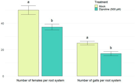 Number of females and galls in root systems of rice plants, 14 days after inoculation with 250 Meloidogyne graminicola second stage juveniles per plant. One day before inoculation, fourteen-days-old rice plants were treated with water (mock) or 500 µM diproline. The bars show the average of 24 plants per treatment, analyzed over three replications. To cancel out batch effects, data from the replicate experiments were combined and normalized. Error bars indicate standard errors, while letters represent statistical differences in comparison with the mock treated plants.