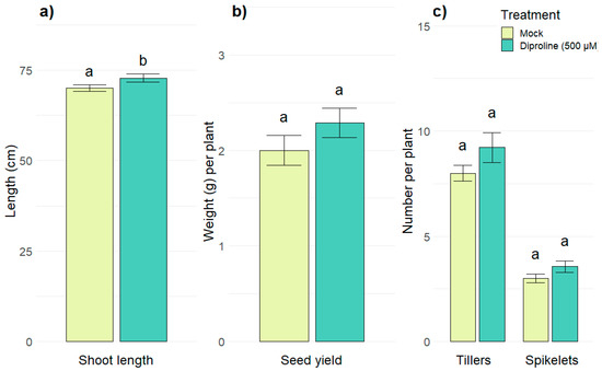 Evaluation of the effects of diproline treatment on plant growth and yield. (a) Shoot length, (b) seed yield and (c) number of tillers and spikelets of four-month-old rice plants after being treated with water or a solution of 500 µM diproline every other week. The bars show the average of 36 plants per treatment, analyzed over two replications. To cancel out batch effects, data from the replicate experiments were combined and normalized. Error bars indicate standard errors. Letters represent statistical differences in comparison with the mock treated plants.