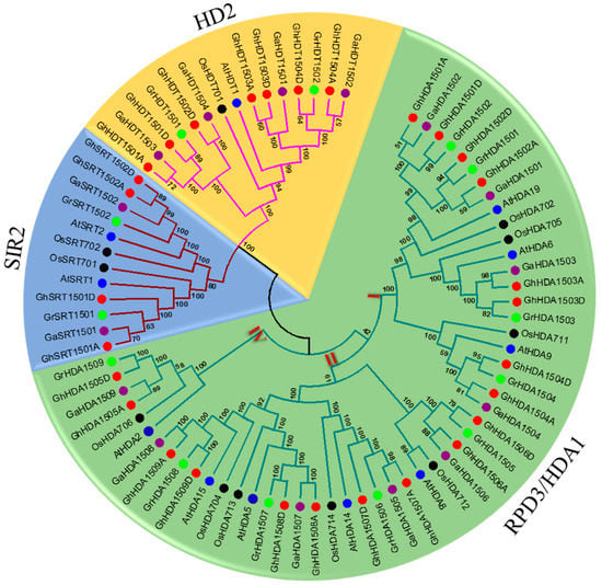 2.1. Identification and Phylogenetic Analysis of Gossypium HDAC