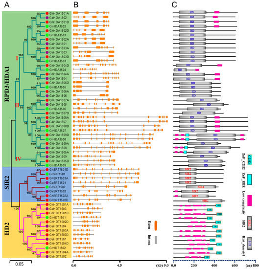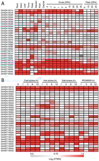 Imran, M.; Shafiq, S.; Naeem, M.K.; Widemann, E.; Munir, M.Z.; Jensen, K.B.; Wang, R.R.-C. Histone Deacetylase (HDAC) Gene Family in Allotetraploid Cotton and Its Diploid Progenitors: In Silico Identification, Molecular Characterization, and Gene Expression Analysis under Multiple Abiotic Stresses, DNA Damage and Phytohormone Treatments. Int. J. Mol. Sci. 2020, 21, 321. https://doi.org/10.3390/ijms21010321