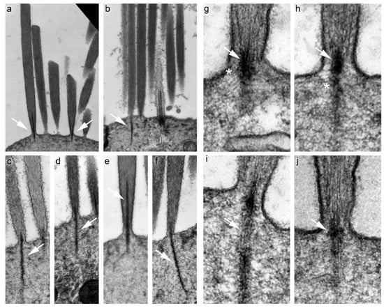 In the mammalian inner ear, horizontal TEM sections show that rootlets within the stereocilium (upper rootlets) have a dense core surrounded by a dense ring, with a gap of non-dense material in between [38]. In outer hair cells, the rootlet is widest just above the entry point to the cuticular plate [38]. The rootlet diameter corresponds to stereocilia height, with longer stereocilia having thicker rootlets [38]. As the rootlet passes down through the taper region, the dense ring converges on the rootlet, so that lower rootlets appear as a solitary dense core with a non-dense gap circling it [38]. In the non-dense gap surrounding lower rootlets, thin fibrils (3–5 nm in diameter) extend outward radially from the rootlet, connecting it to the meshwork of the cuticular plate (Figure 2b) [34,35,38,41,45]. These radial fibrils are most numerous at the apex of the cuticular plate, with the number and length of fibrils decreasing as the rootlet plunges deeper [45]. Other filaments form rootlet–rootlet connectors within the cuticular plate [34]. Neither the radial fibrils nor the rootlet–rootlet connectors decorate with S1 myosin fragments, which are specific for actin filaments, suggesting that these filaments are comprised of proteins distinct from actin [41,45].