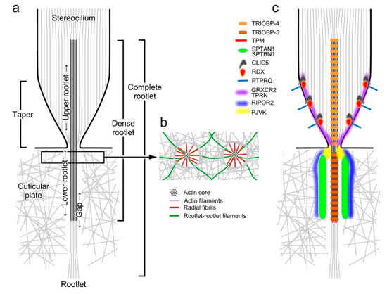 Hair cell rootlets were first noted in 1965 in transmission electron microscopy (TEM) images, where they appear as dark, splinter-shaped densities associated with stereocilia [33]. Rootlets are osmiophilic and therefore appear as heavily stained structures in conventional TEM micrographs (Figure 1). A single rootlet appears as a core within a stereocilium, starting halfway down or lower, and extends down through the tapered region and into the cell soma, anchoring into the cuticular plate (Figure 2a). The rootlet thus forms a bridge that connects the stereocilium and cuticular plate. Rootlets contain uniquely organized actin [34,35,36], with a higher density of filaments than in either the stereocilia or the cuticular plate.