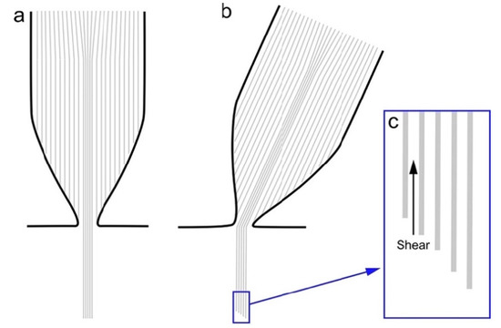 Hypothesis for rootlet filament movement during stereocilia pivoting. (a) Rootlet actin filaments are mechanically similar to 1/4” steel cables—flexible but inextensible. Multiple rootlet filaments are bundled together, probably with TRIOBP. (b) If rootlet filaments are capable of shearing (sliding with respect to each other), then during stereocilia pivoting, filaments furthest from the direction of the pivoting (left in this diagram) will shear more than those closest to the direction of pivoting. (c) Magnified view of the soma ends of rootlets illustrating differential shear of rootlet filaments.